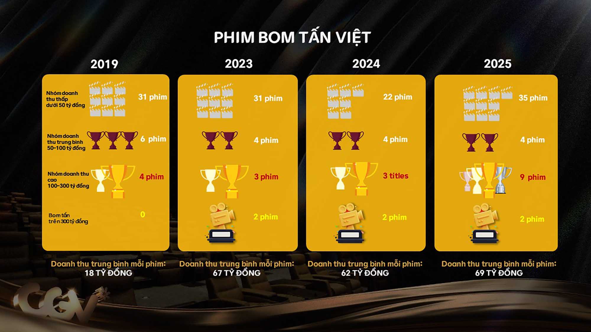 Trong khi nhiều thị trường quốc tế vẫn đang nỗ lực để quay lại mức doanh thu phòng vé trước dịch, điện ảnh Việt Nam không chỉ nhanh chóng phục hồi mà còn bước vào giai đoạn tăng trưởng mạnh mẽ. Báo cáo của CGV cũng cho thấy trong giai đoạn 2023 – 2025, mức tăng trưởng doanh thu phòng vé hàng năm của Việt Nam đạt trên 20%.