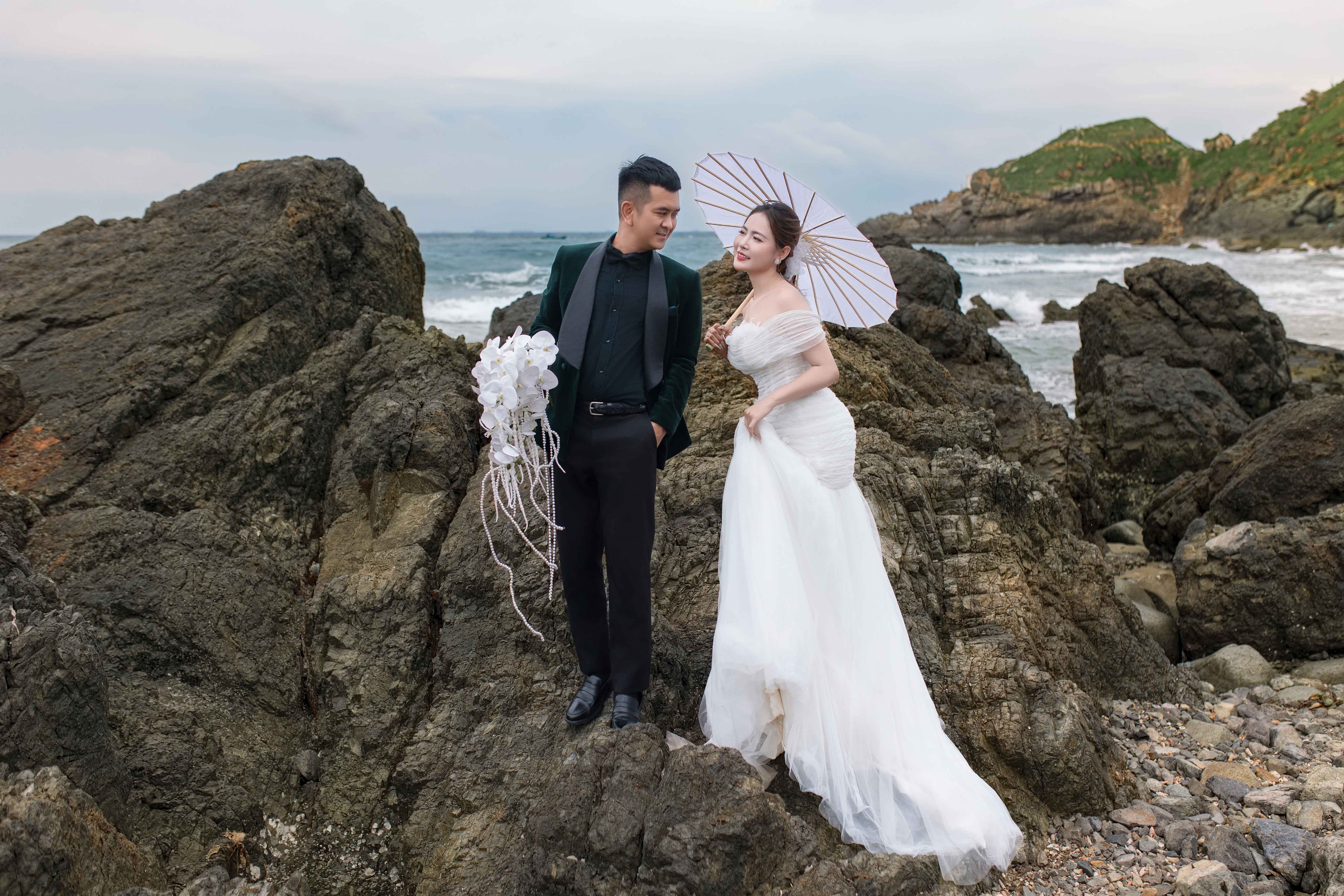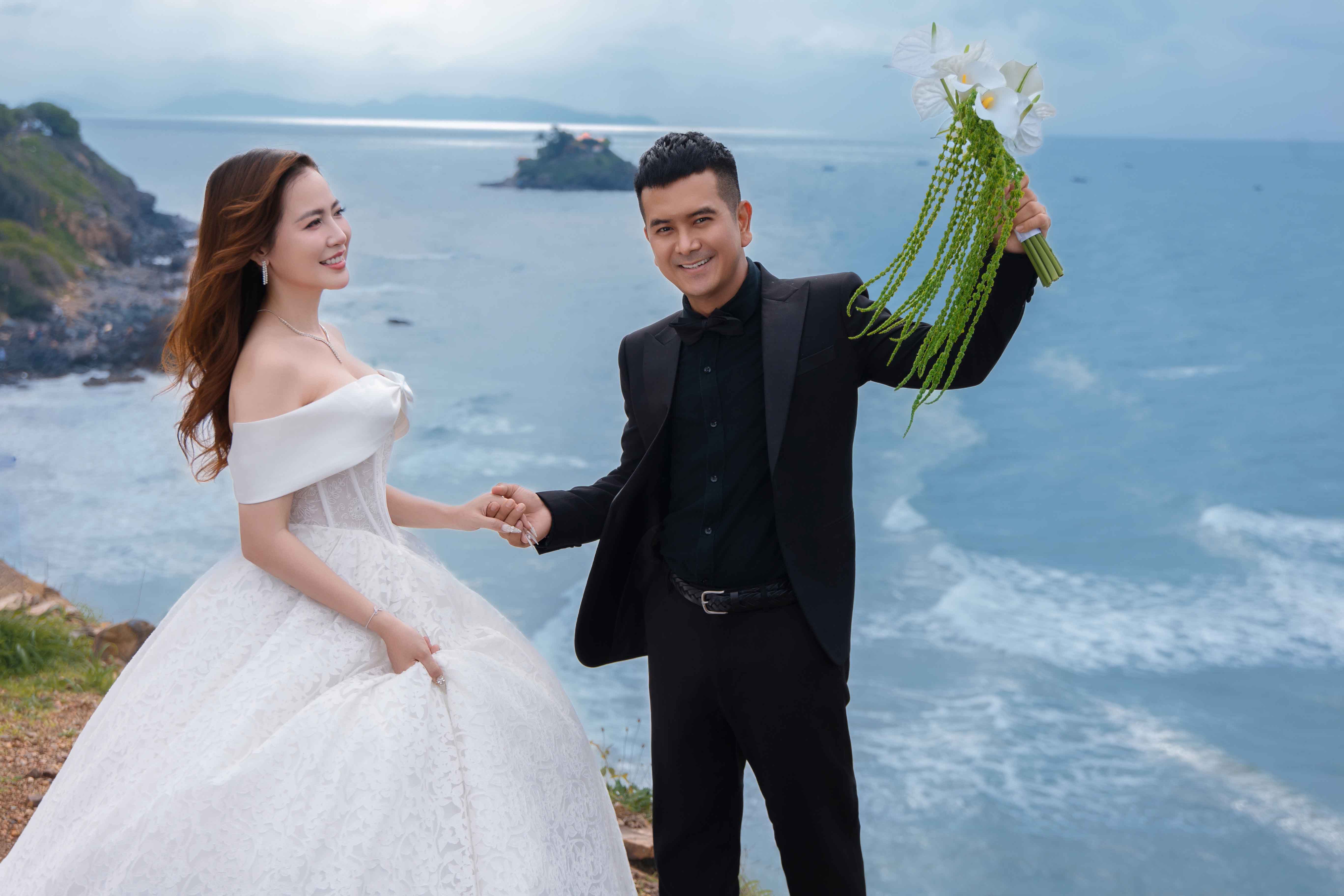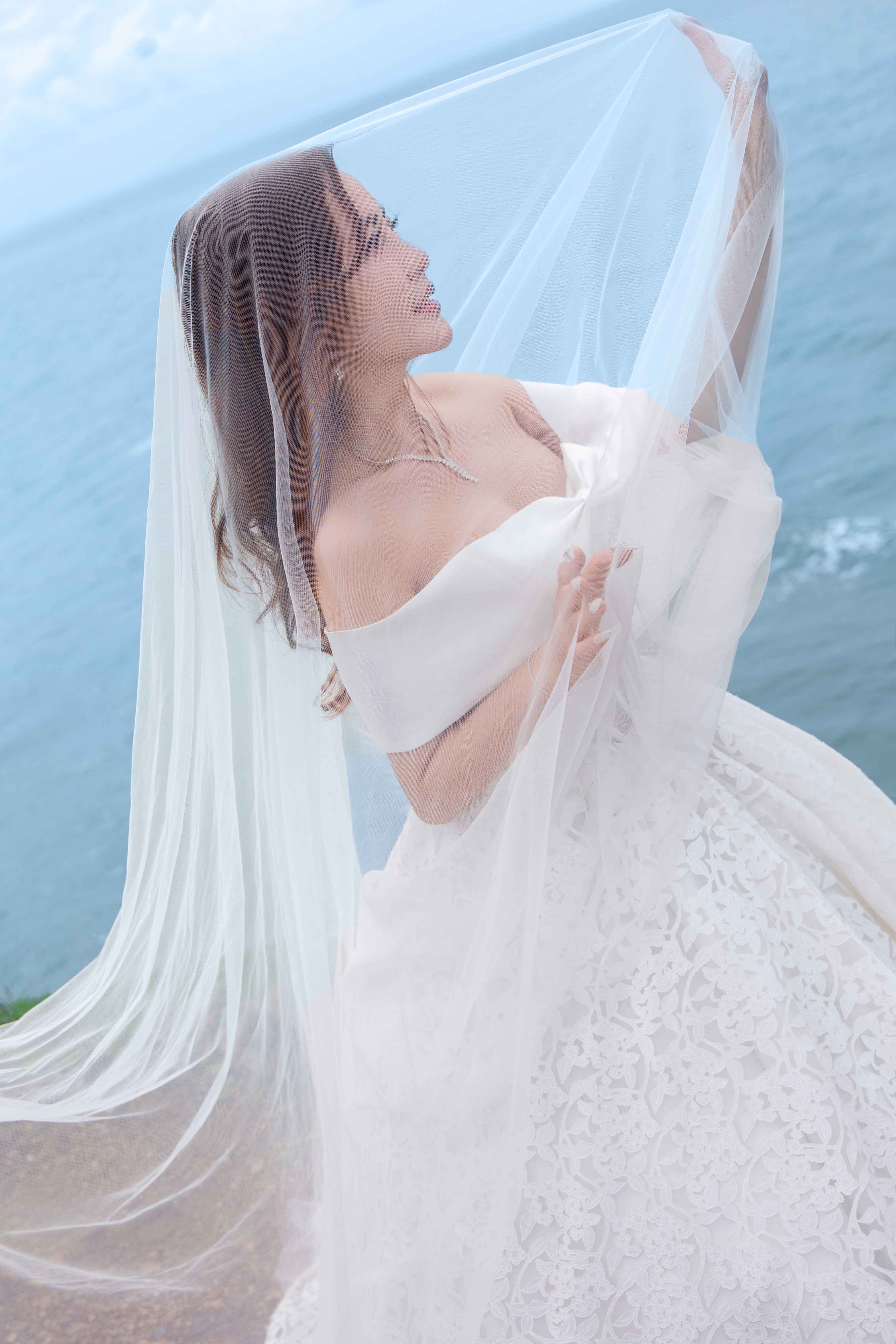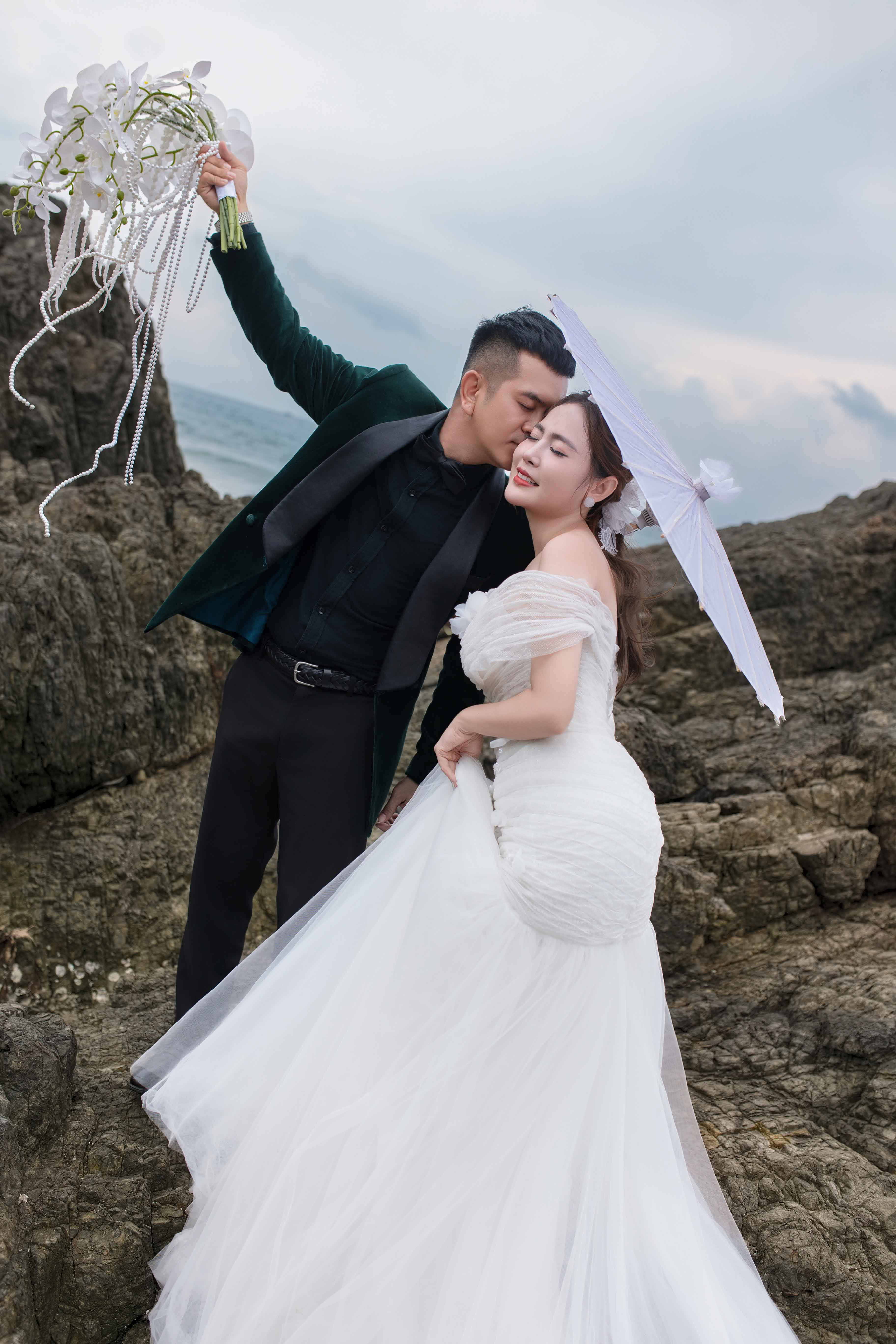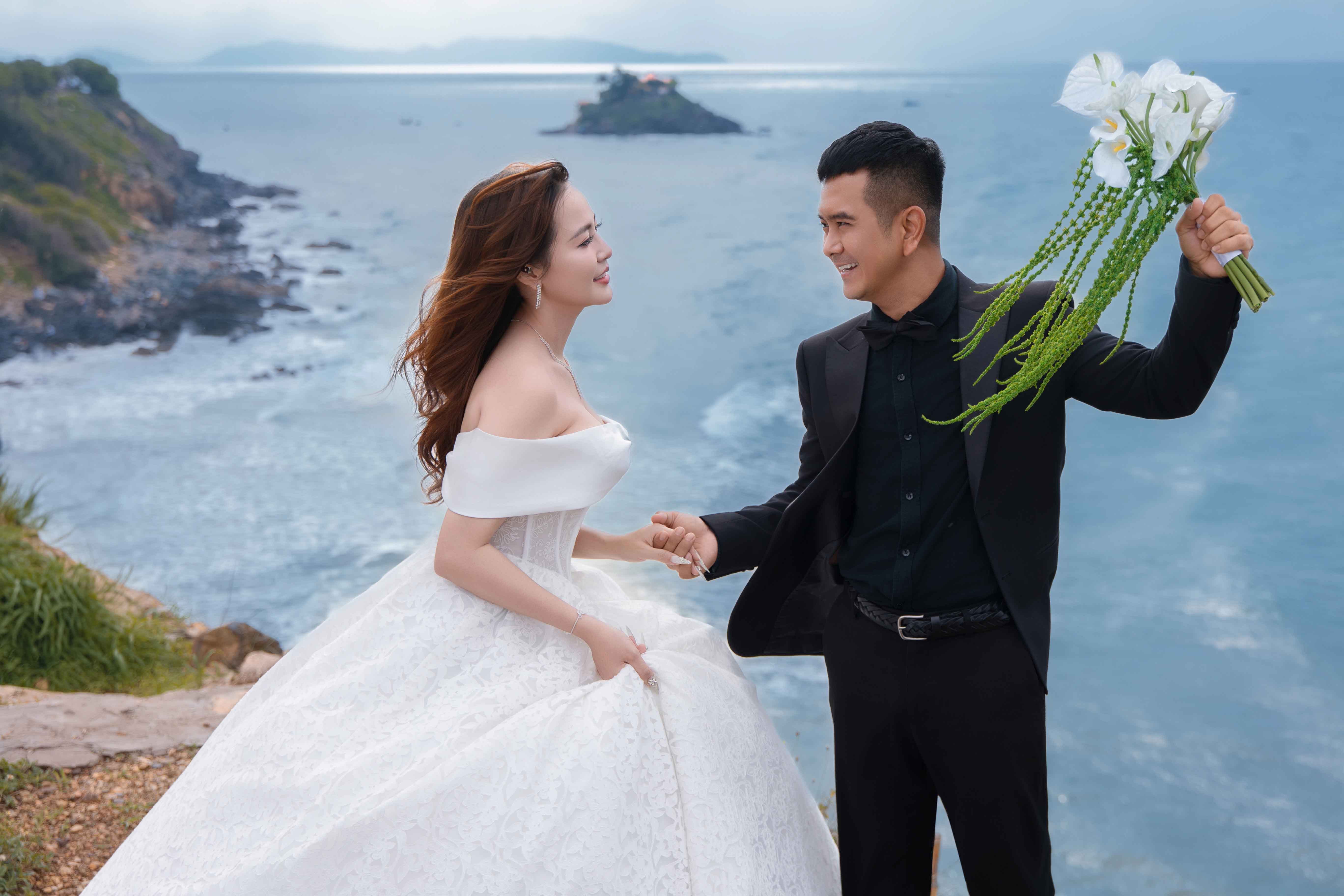 Tại Hồ Cốc, điểm đến nổi bật của Vũng Tàu, cặp đôi lựa chọn khung cảnh biển trời khoáng đạt làm phông nền cho những bức ảnh đầy thi vị. Thanh Tâm xuất hiện duyên dáng trong hai mẫu váy cưới trắng chủ đạo một chiếc đầm bồng xòe mang phong cách công chúa nhẹ nhàng, một chiếc đầm đuôi cá tinh tế tôn dáng. Cả hai thiết kế đều khai thác chất liệu bay bổng và chi tiết ren mềm mại, gợi lên hình ảnh một cô dâu dịu dàng mà vẫn hiện đại. Đồng hành bên cạnh, Hùng Thuận diện vest lịch lãm, tạo nên một tổng thể hài hòa, sang trọng.