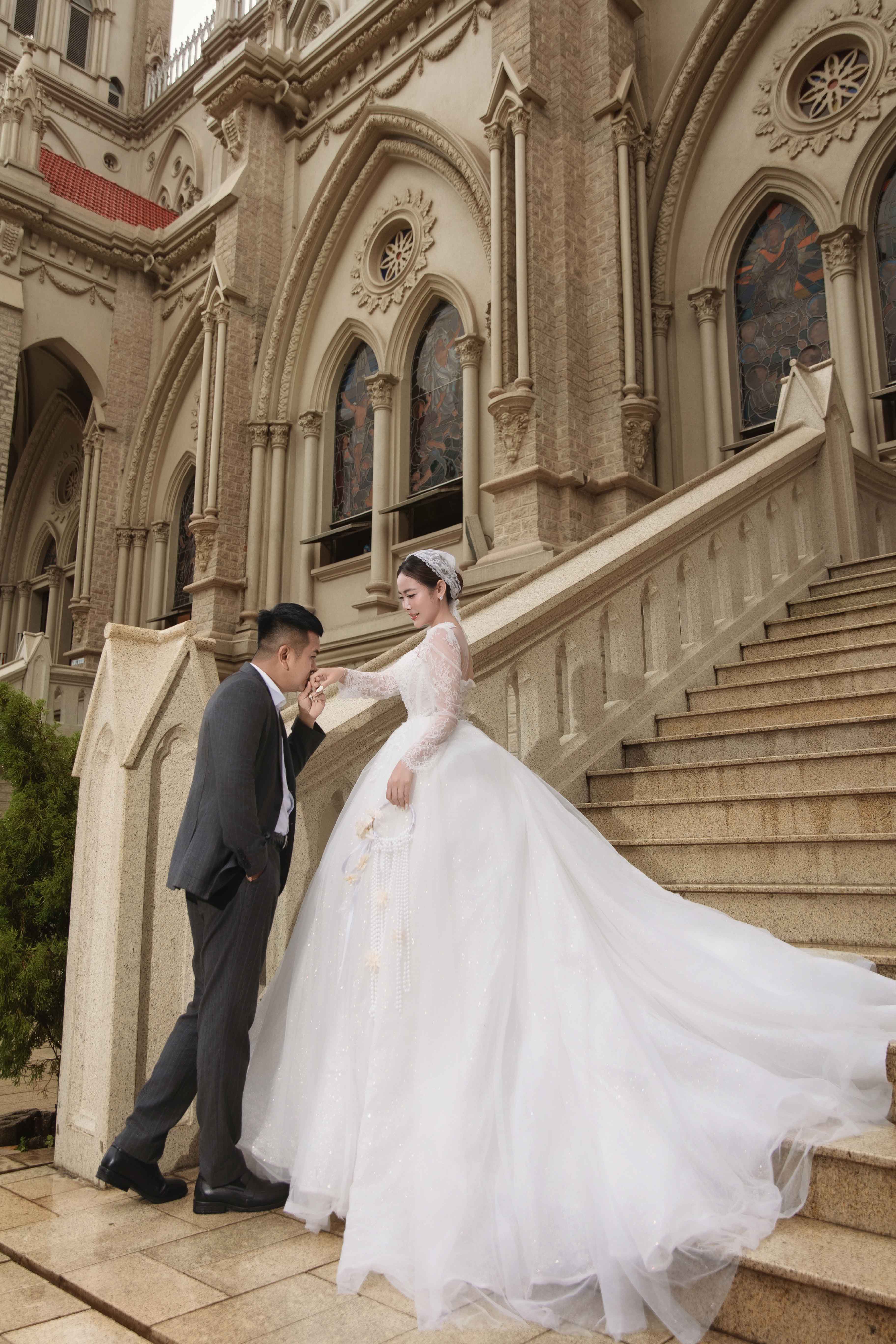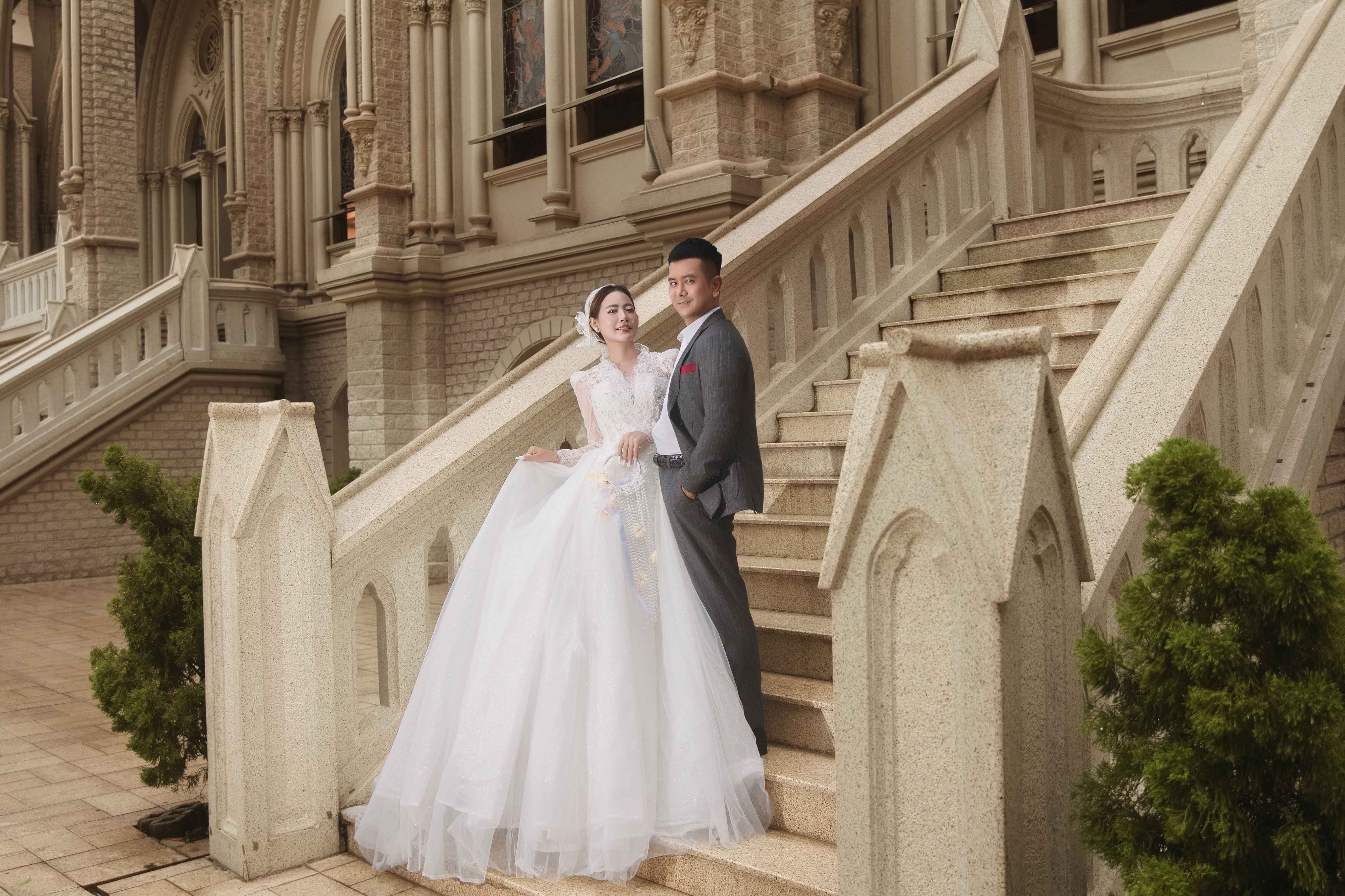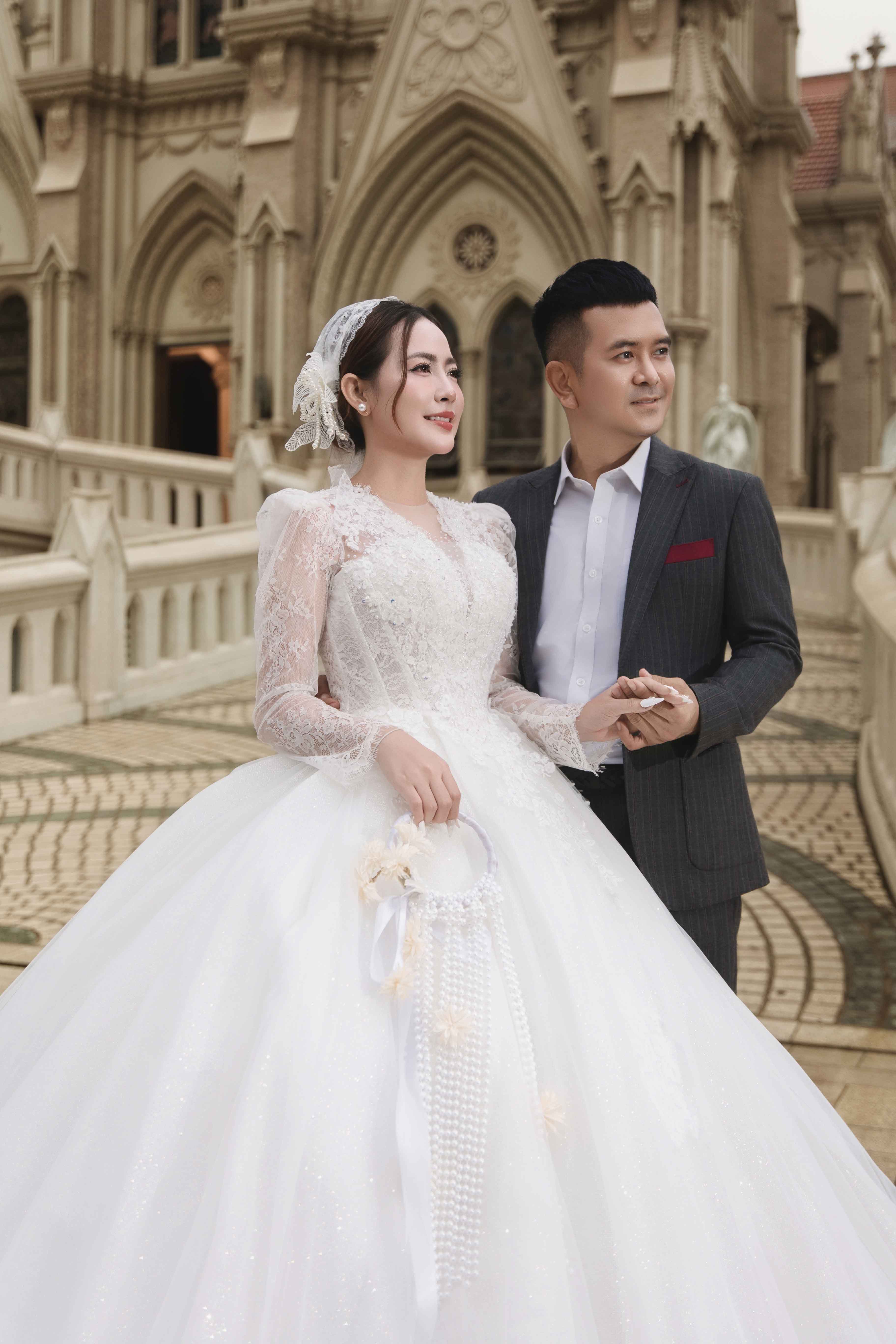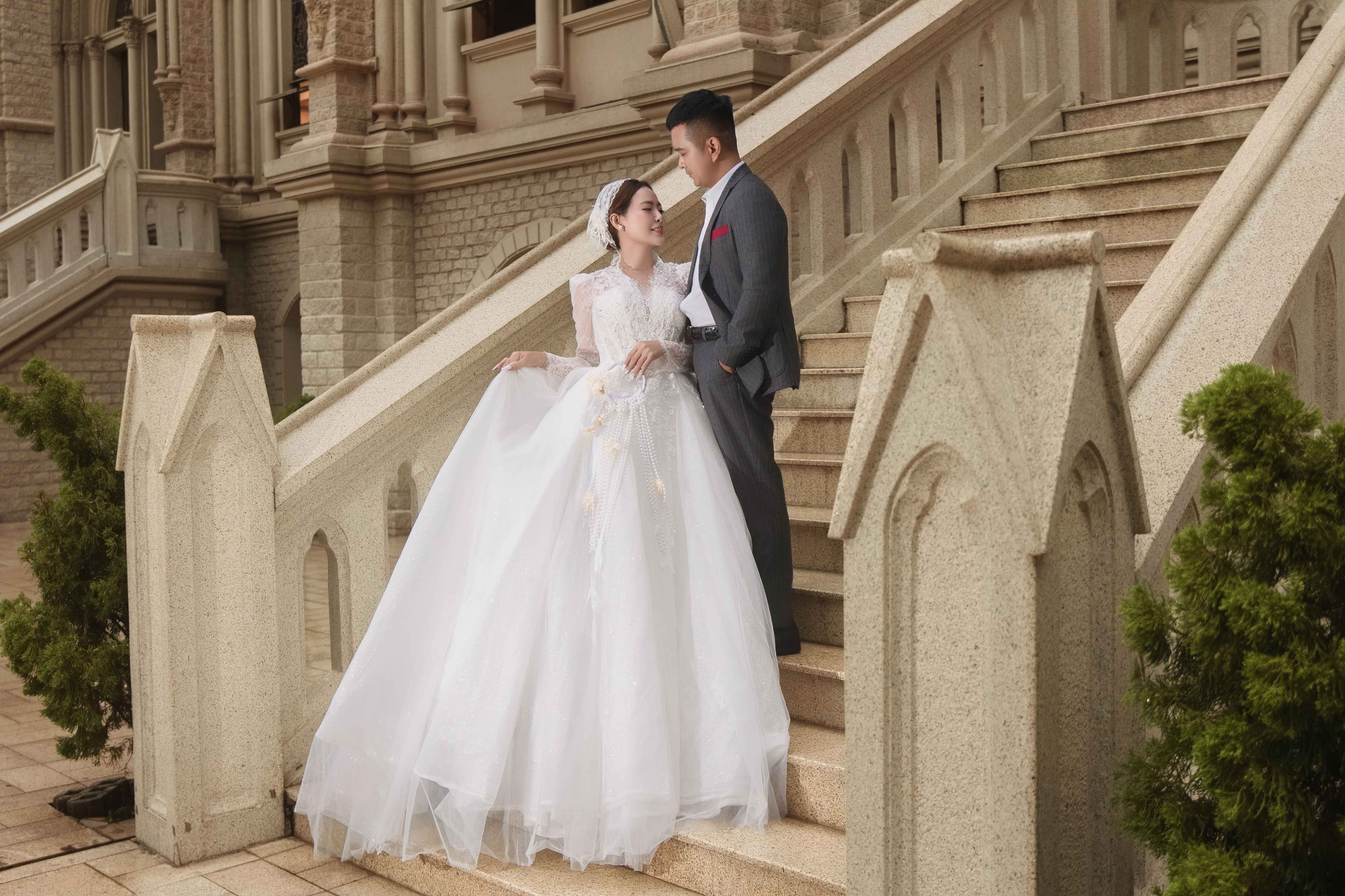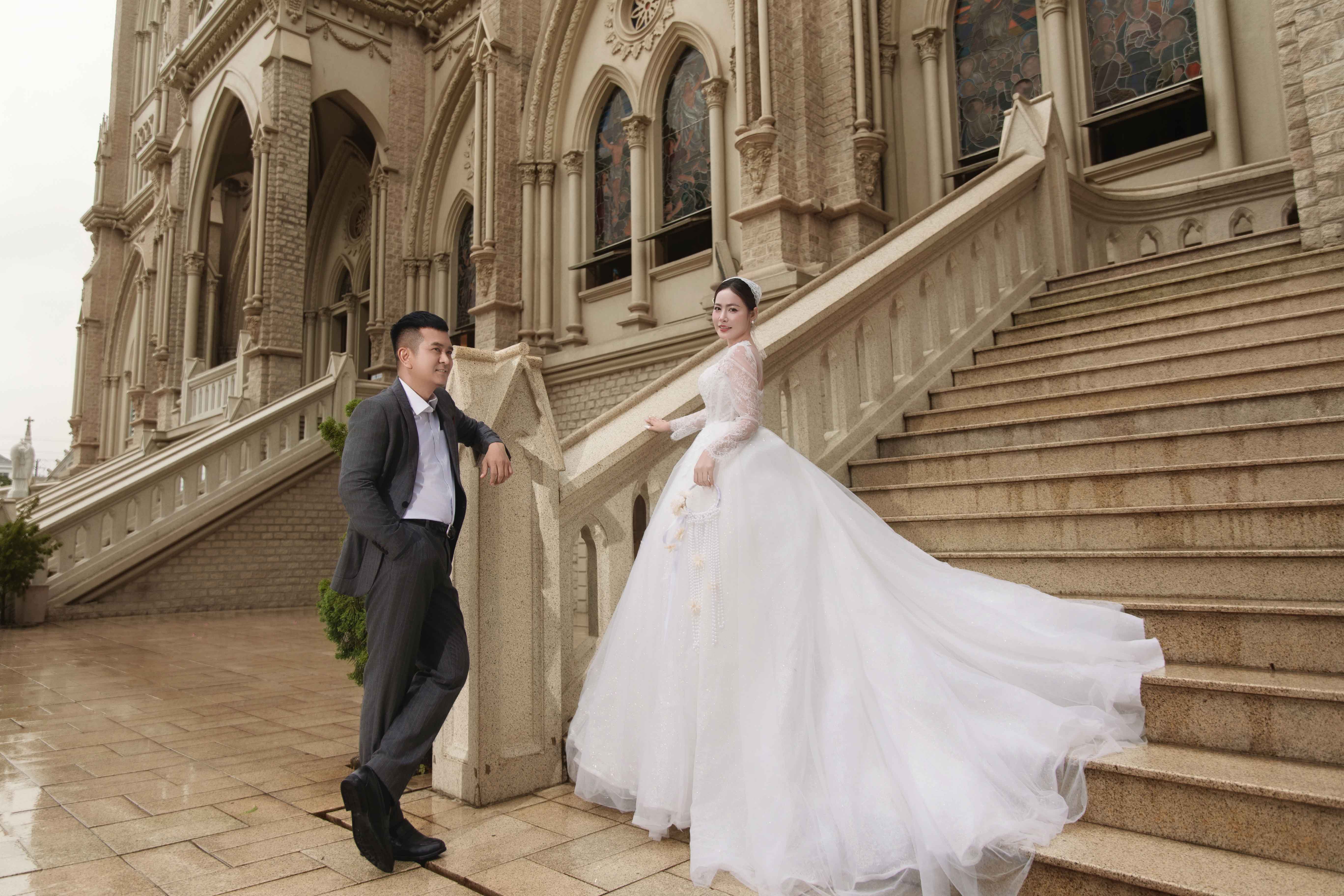 Không chỉ dừng lại ở biển trời Hồ Cốc, cặp đôi còn chọn nhà thờ Song Vĩnh làm điểm dừng chân thứ hai cho bộ ảnh cưới. Tại đây, Thanh Tâm diện bộ váy cưới cổ điển, thanh lịch được xử lý ren thủ công tinh xảo, sánh bước bên Hùng Thuận trong bộ vest tone xám nhã nhặn.